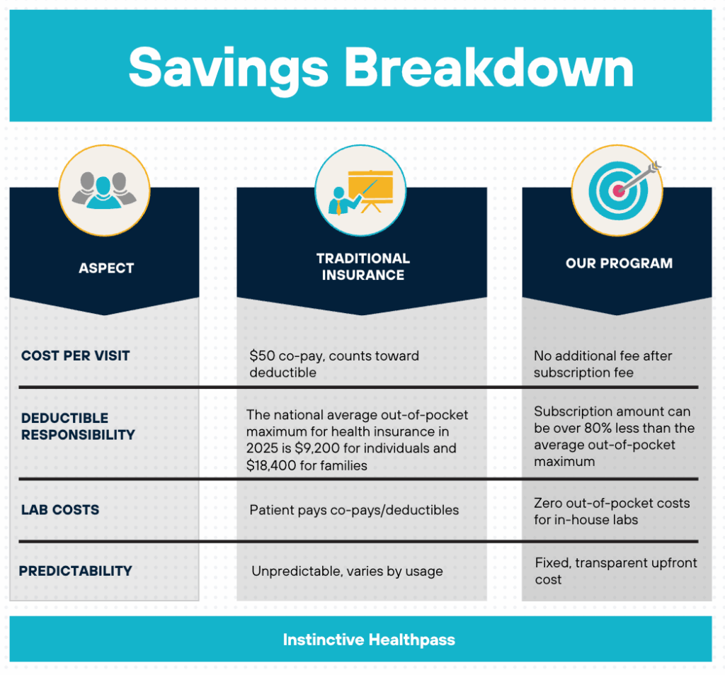 With an Instinctive Healthpass membership, you can say goodbye to surprise bills and hello to unlimited access to top-tier care, all for a fraction of your maximum out-of-pocket cost.